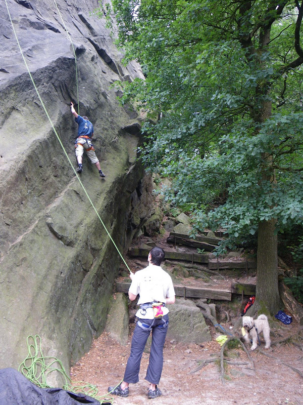 На утро побежали лазить. Идти до скал тут раза в два-три дольше чем в Бердорфе, но дорога приятная, через лес. Лазают на нескольких скалах, которые разбросаны по лесу, мы как-то с самого начала облюбовали один из них, третий по величине, как оказалось. Описания у нас не было, потому собирались лазить по памяти. Память выдавала очень смешные штуки, а нашедшийся у проходящих мимо голландцев гид с немецкими оценками - вообще доставлял. Первый маршрут, который мягко говоря полная жопа огурцов - там стоит как 4+. На деле это твердая 5с, не меньше. А с местными пролетами... Вообще когда первый шлямбур на выосте 4-5 метров - это бодрит провешивающего.